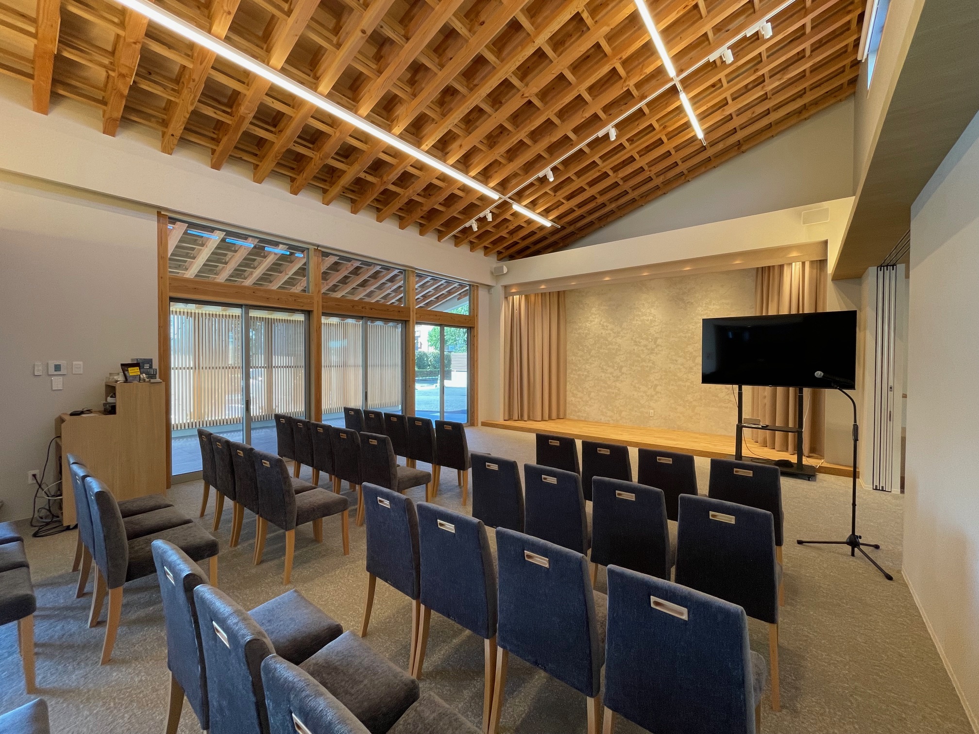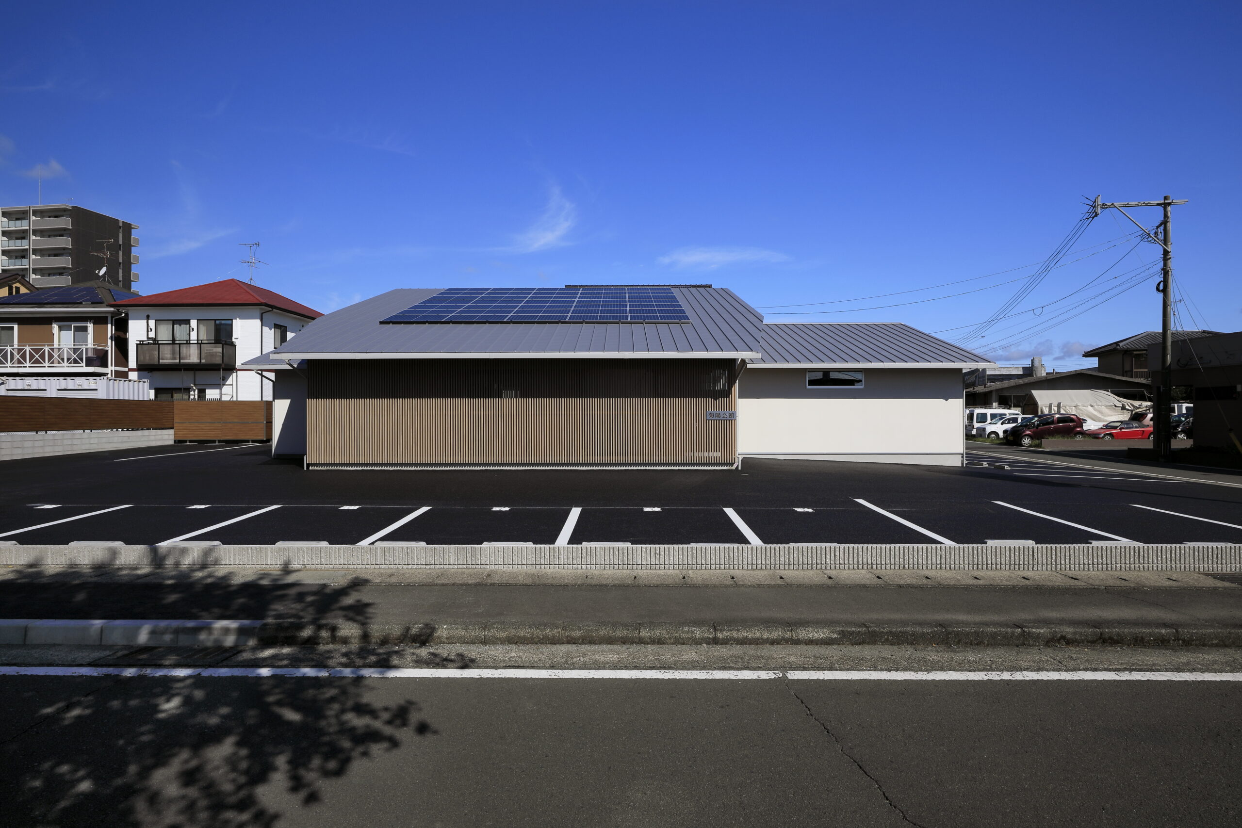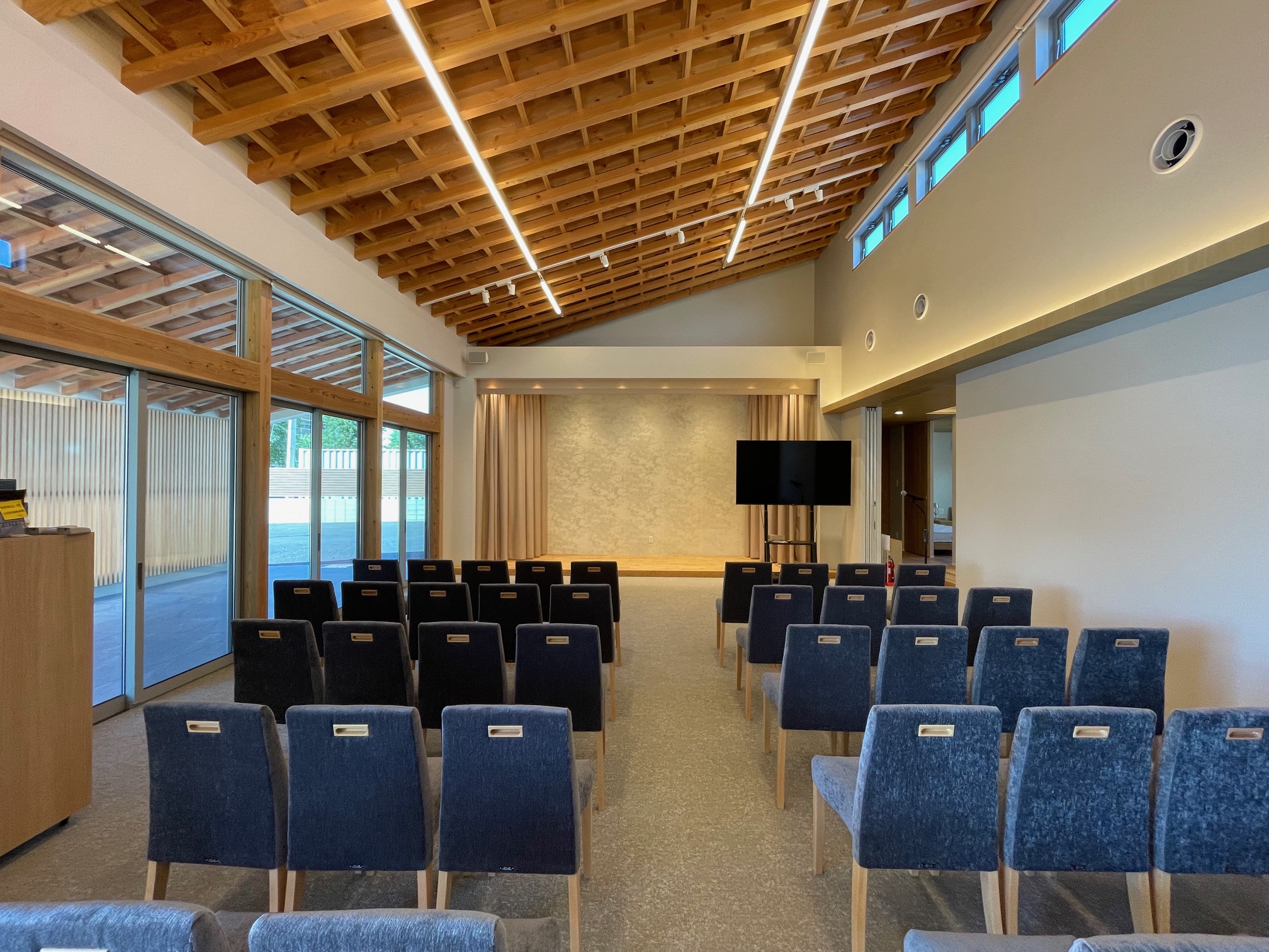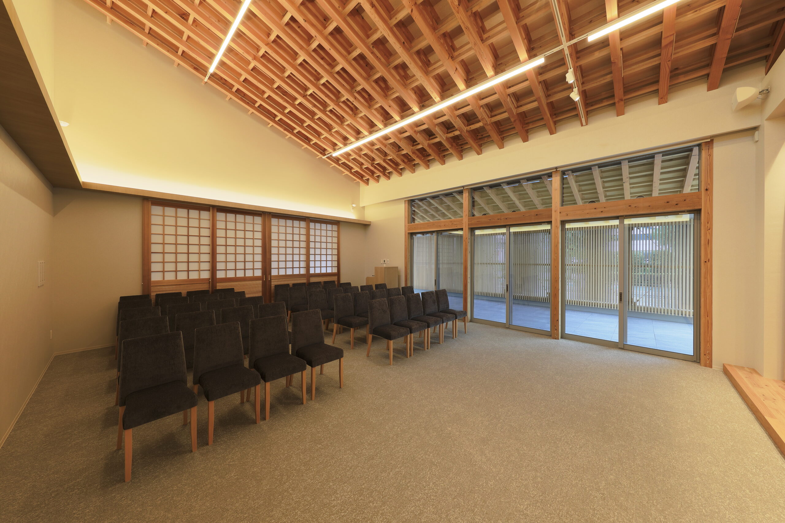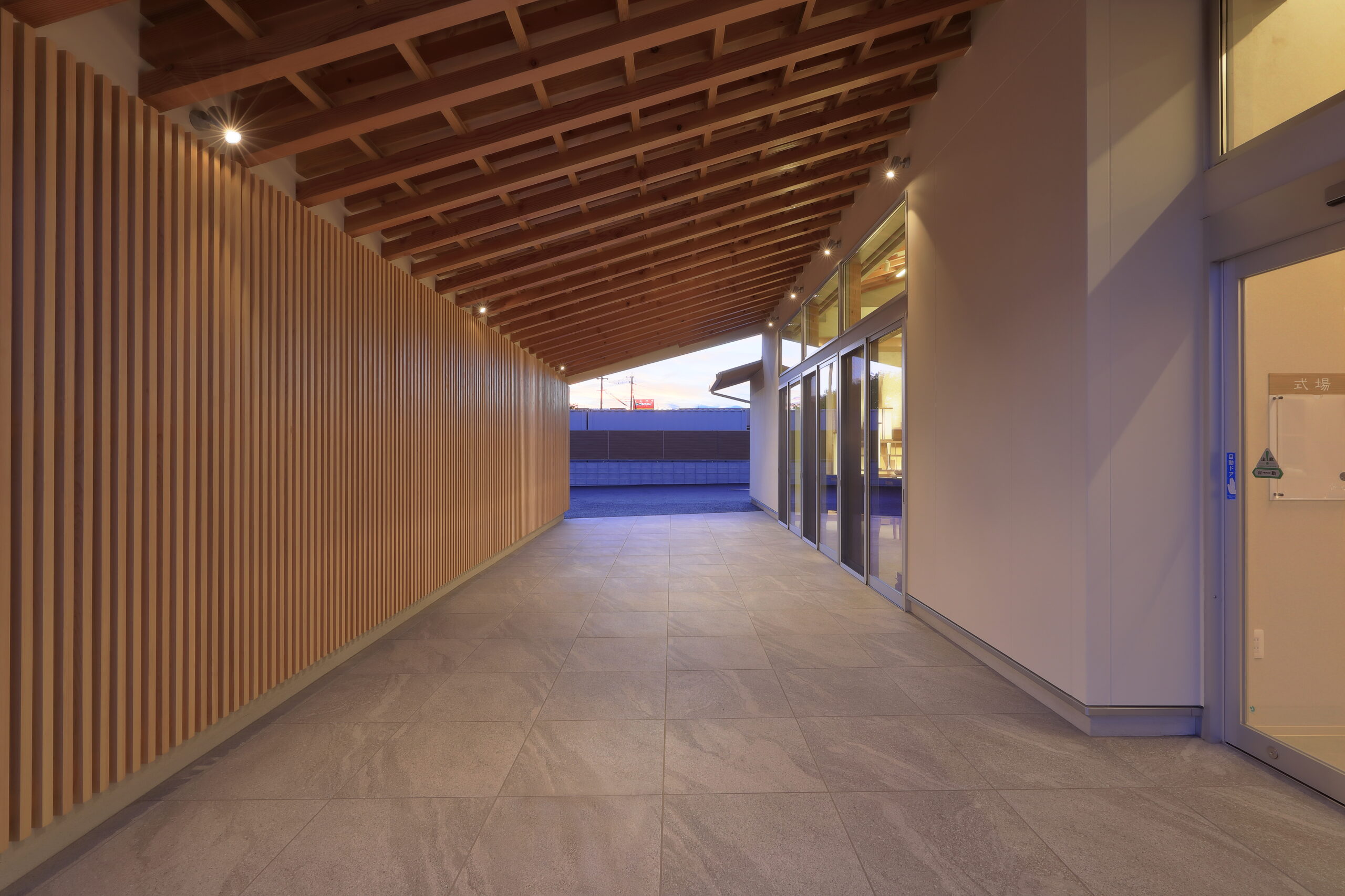 建物は、大空間の式場と車寄せを連続させることで、送りの動作が自然に流れる構成とし、内部外部の関係を緩やかにつなげている。構造には一般流通材を用いながら、梁の重なりや透けを操作することで、空間に奥行きと静けさを与えている。