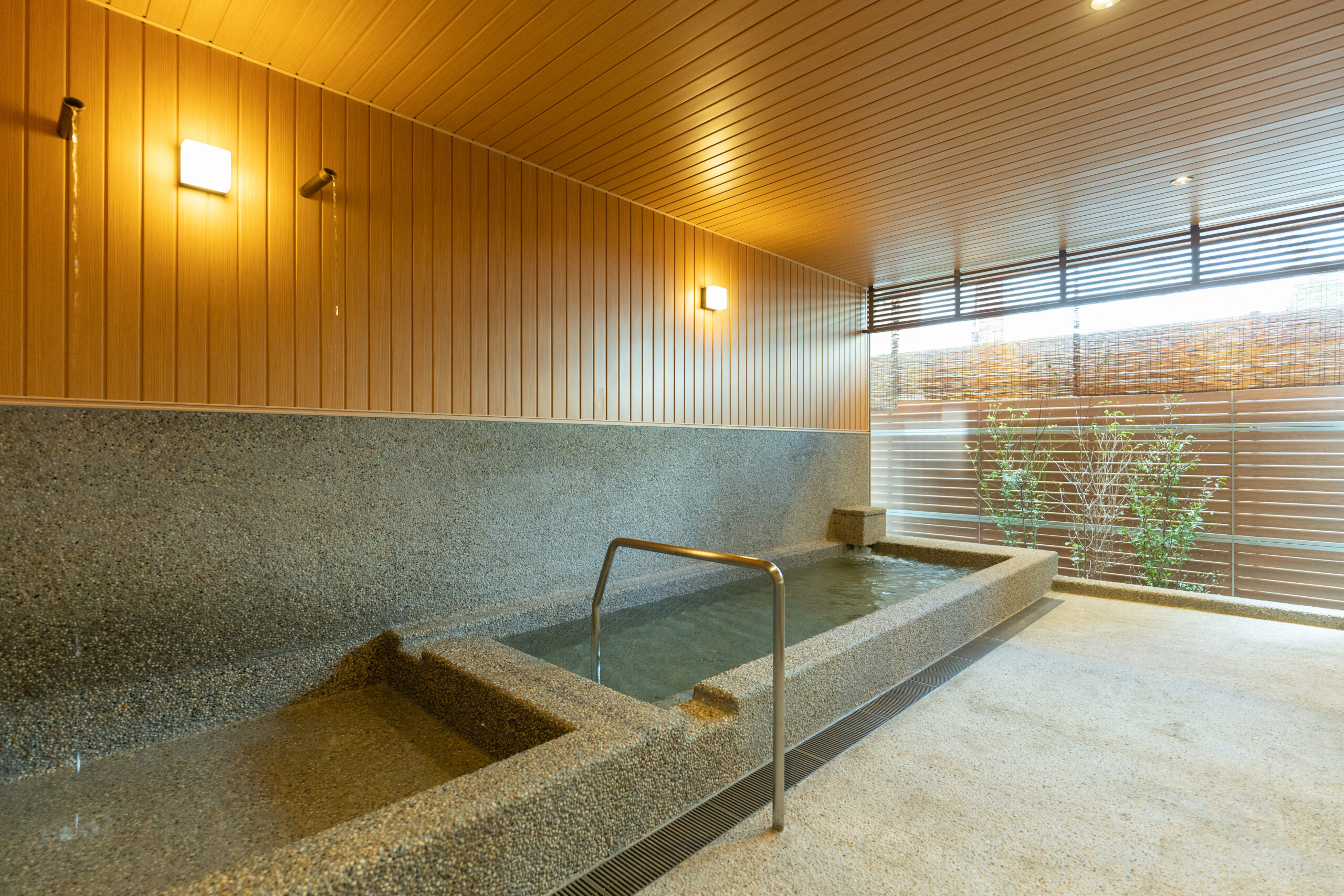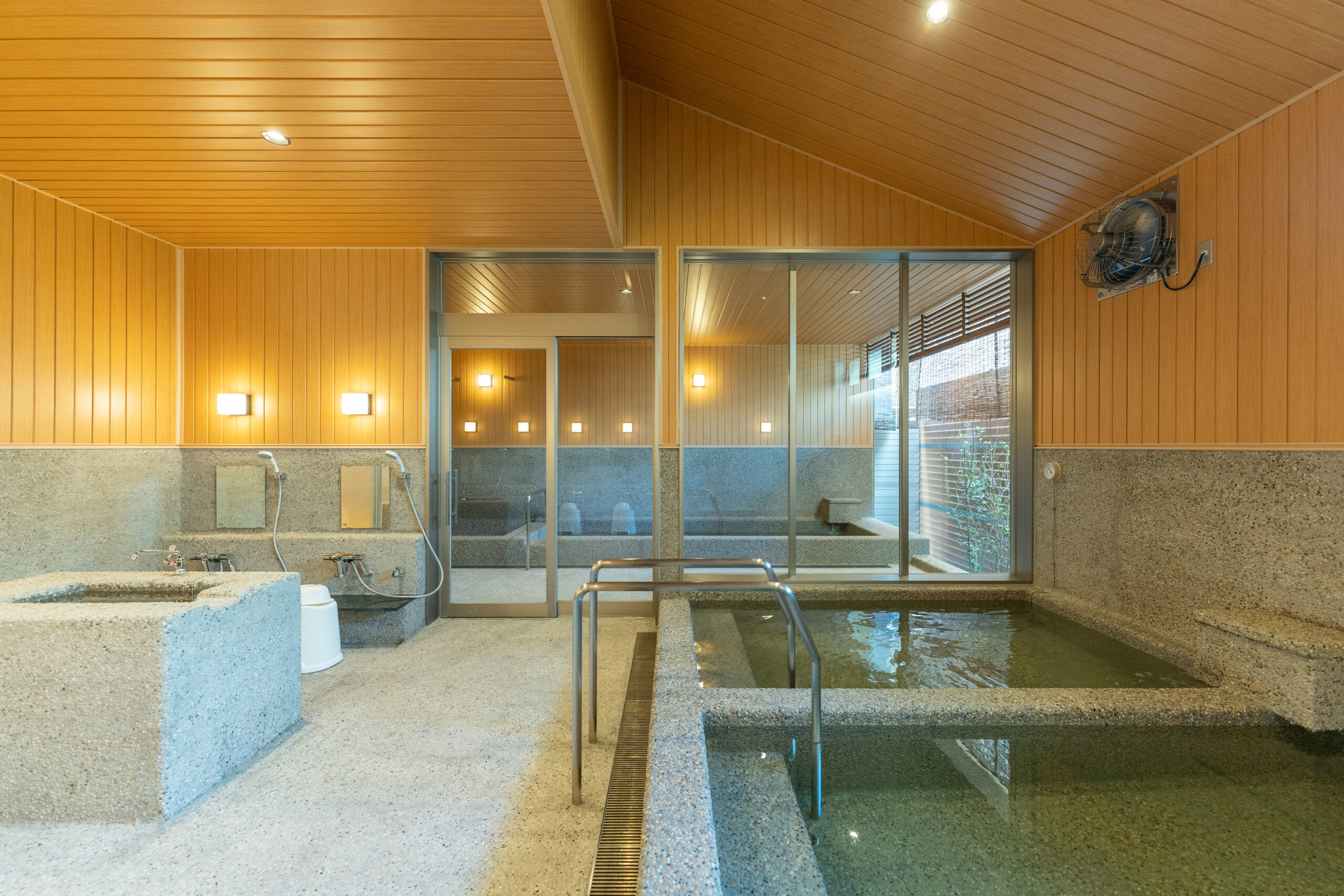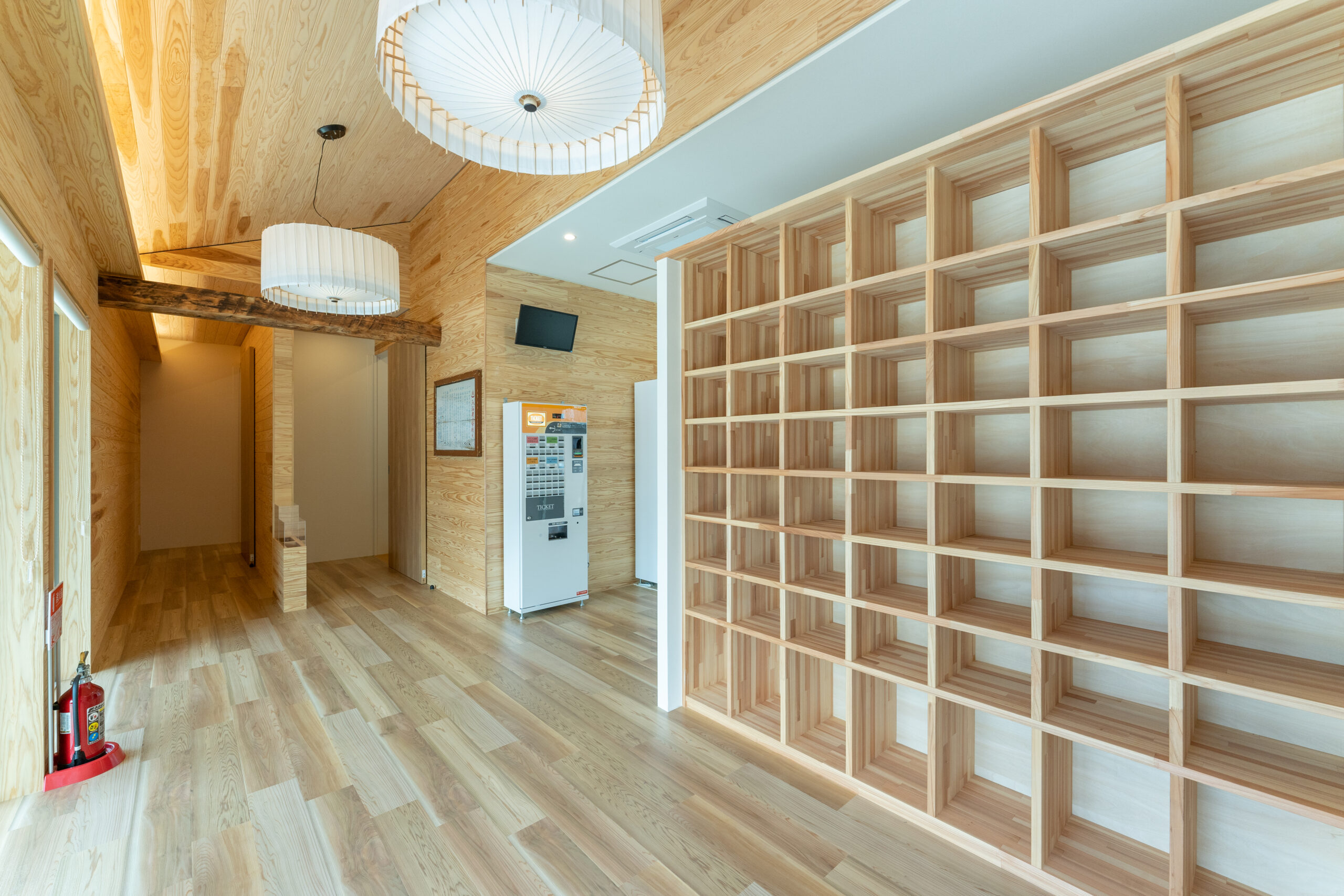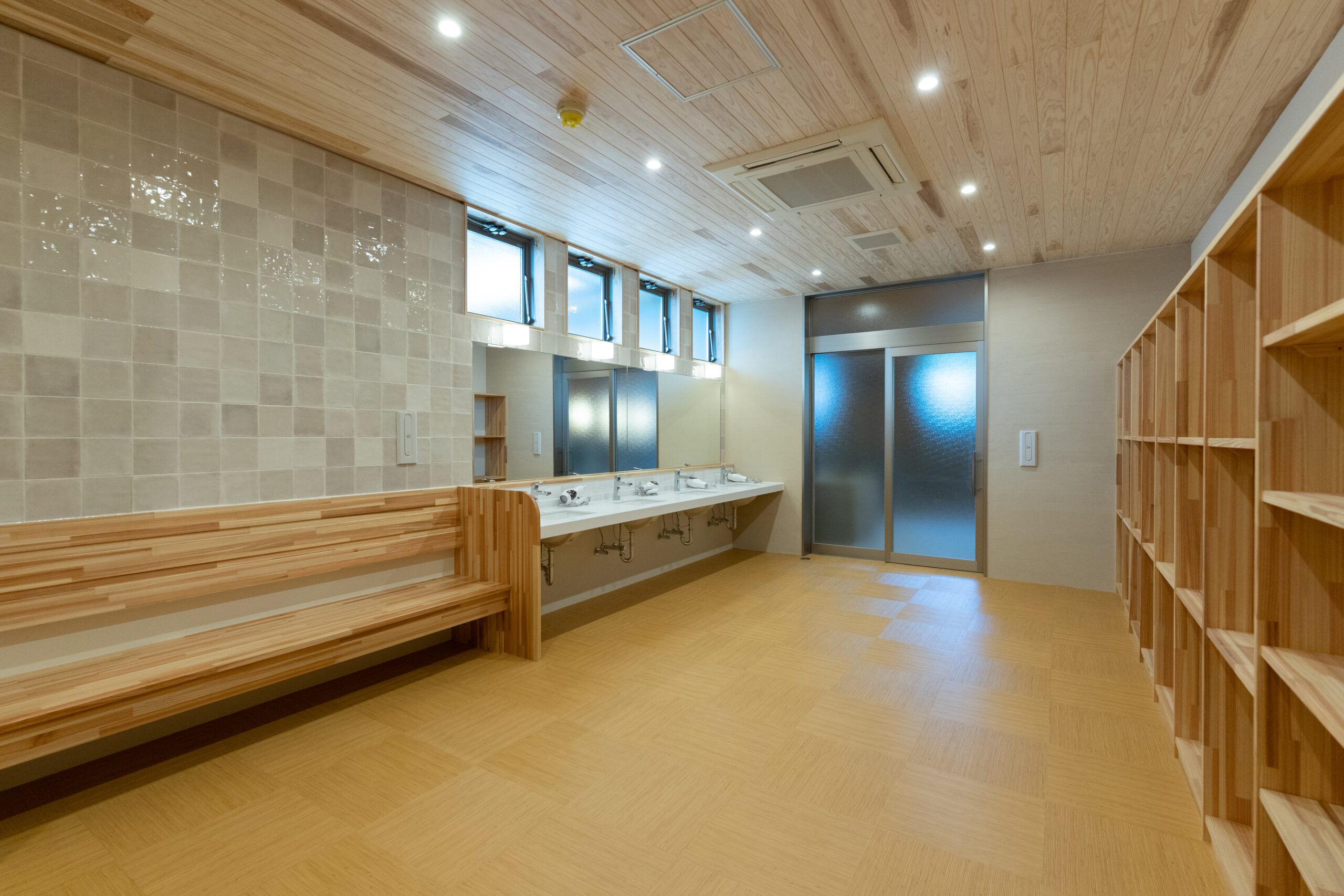 100年以上続く歴史ある温泉の建て替えの計画である。老朽化と水害により、やむなく建て替えの計画となり、既存の愛されて来た建物形状を踏襲しつつ設計した。アプローチである軒下空間にふんだんに熊本県産の杉材を使用した外壁の軒裏で構成し、耐久性に配慮しながら既存建物を踏襲した仕上げを積極的に採用した。
