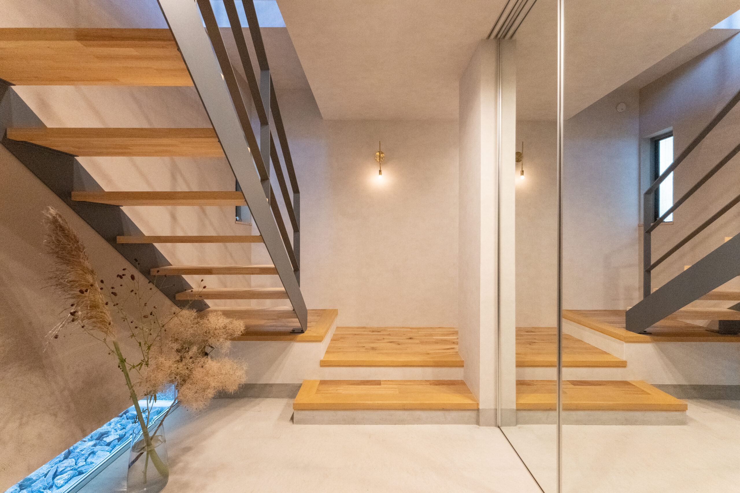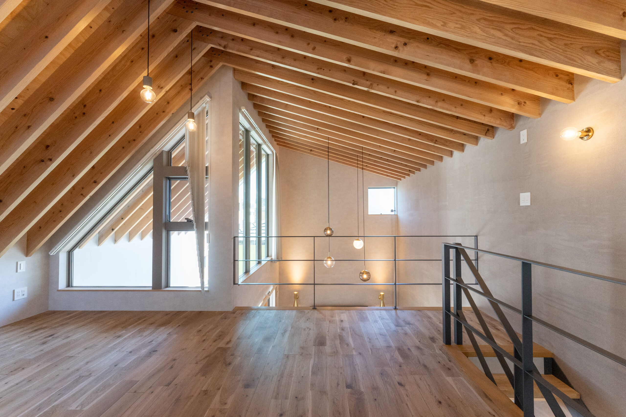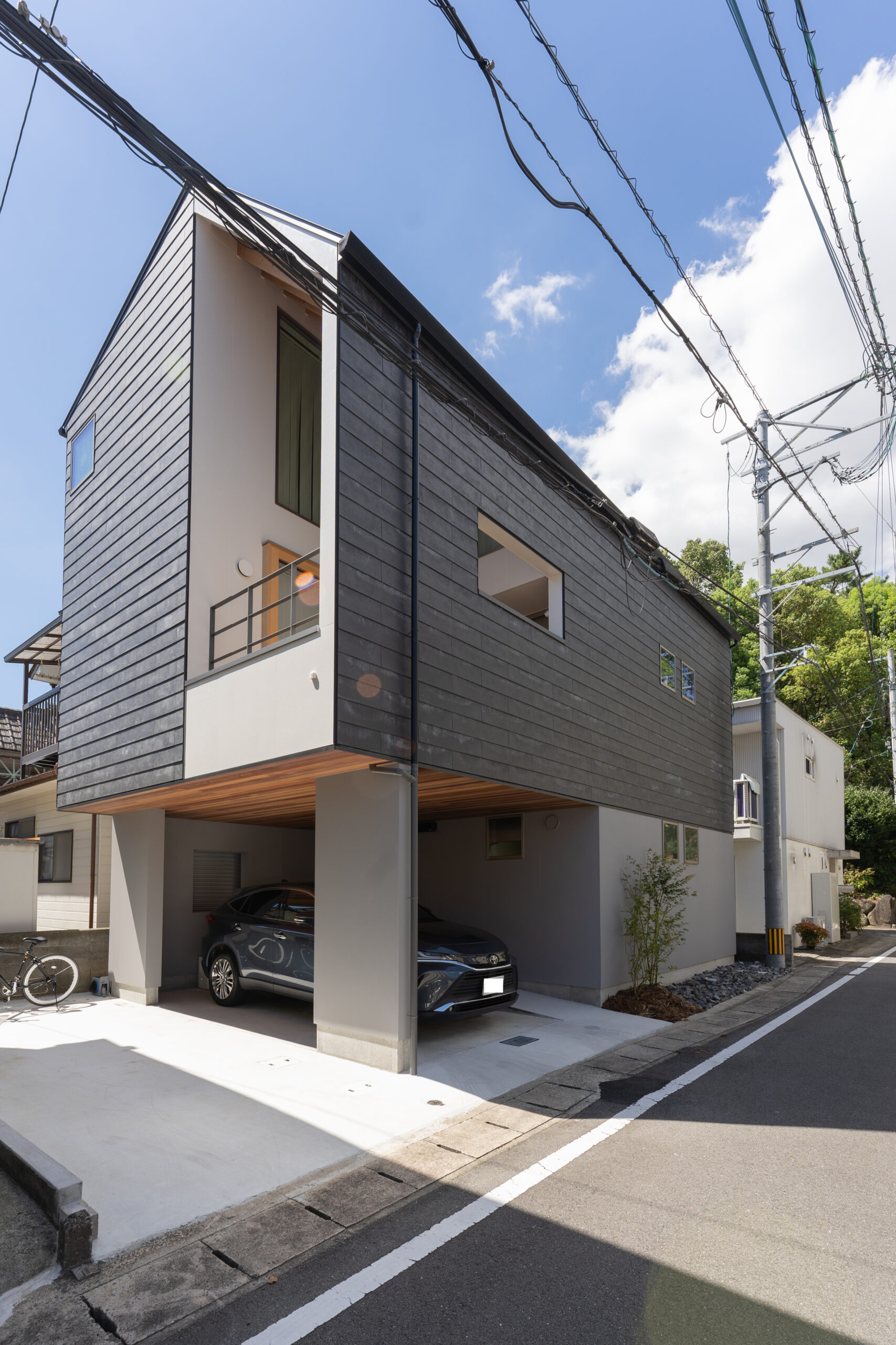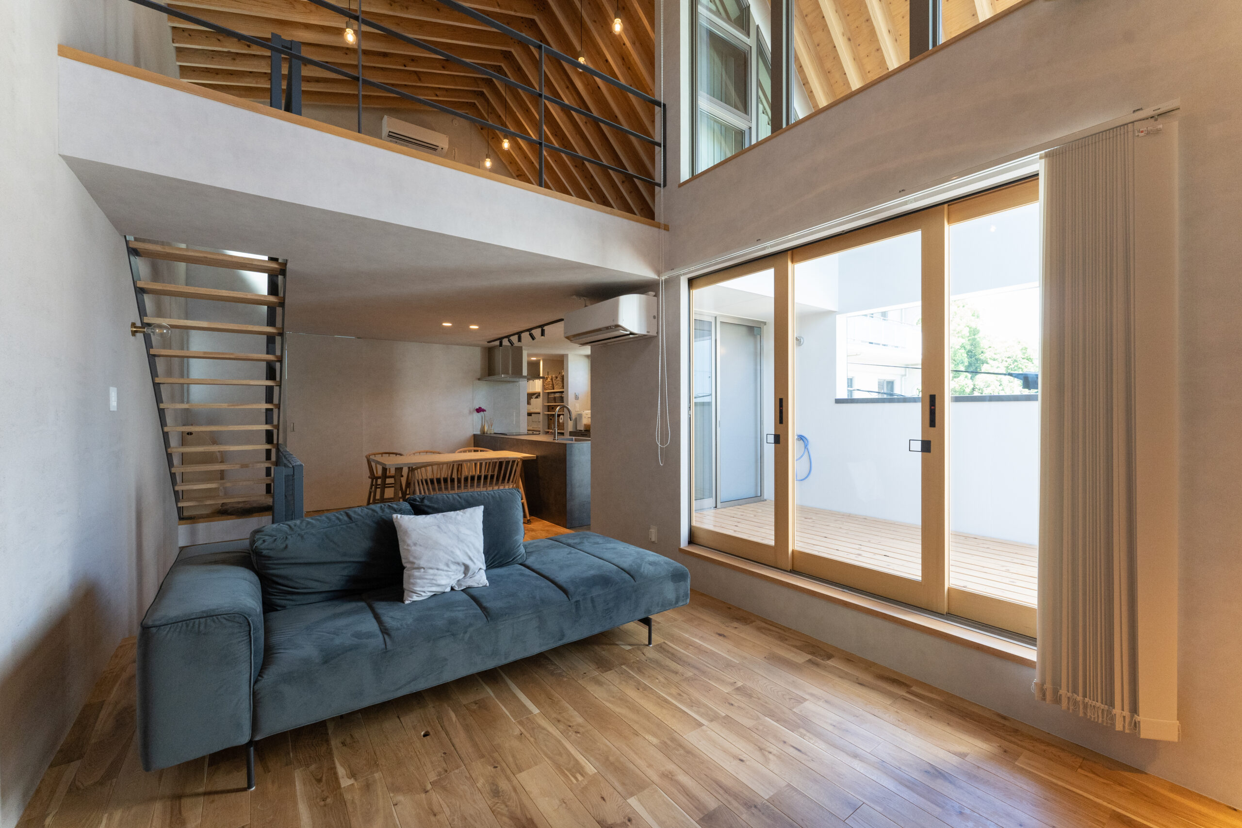 計画敷地は、30坪弱程度で狭小敷地の典型のような場所でした。そこに、容積や高さ制限いっぱいのボリュームから、必要な外部空間を抜き取っていくような設計を行いました。日当たりや視線を考慮しながら外部空間を抜き取っていき、さらに内部から外部に対して連続した空間となるように素材を統一し、内部から外部の見せ方にも配慮した開口を設ける事で、都市の中でも外部を内部に取り込むような設計としました。
